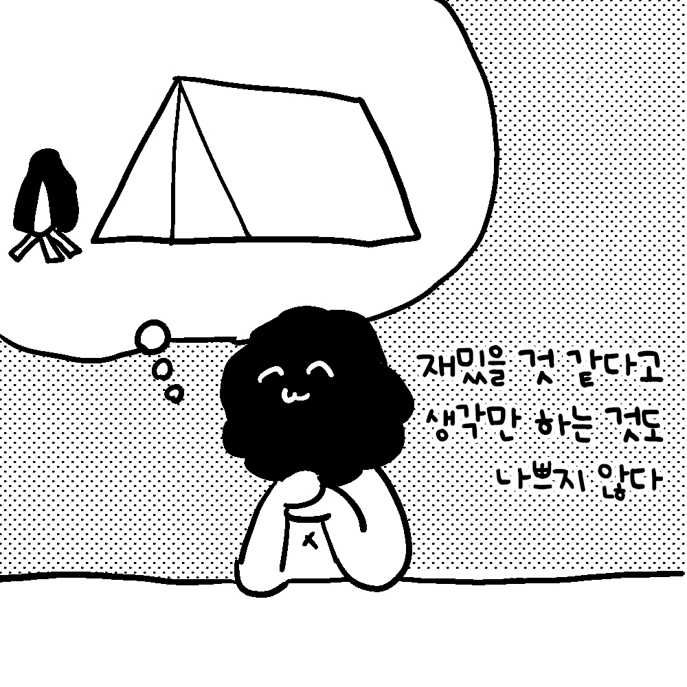 그렇다고 실제로 일어나서 캠핑을 나가는 건 아니에요. 그냥 의자에 엉덩이가 용접된 상태로 그대로 남아 있죠. 게다가 내가 진짜 캠핑을 해봤자 재미없을 거라는 것도 알고 있어요.
