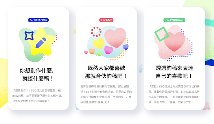 可能會有人會因為對作品的責任感而猶豫該不該使用約稿功能,但pixiv約稿功能並不是工作,而是「任創作者與粉絲能夠更加享受創作活動的地方」,所以保持享受創作的心情是非常重要的。