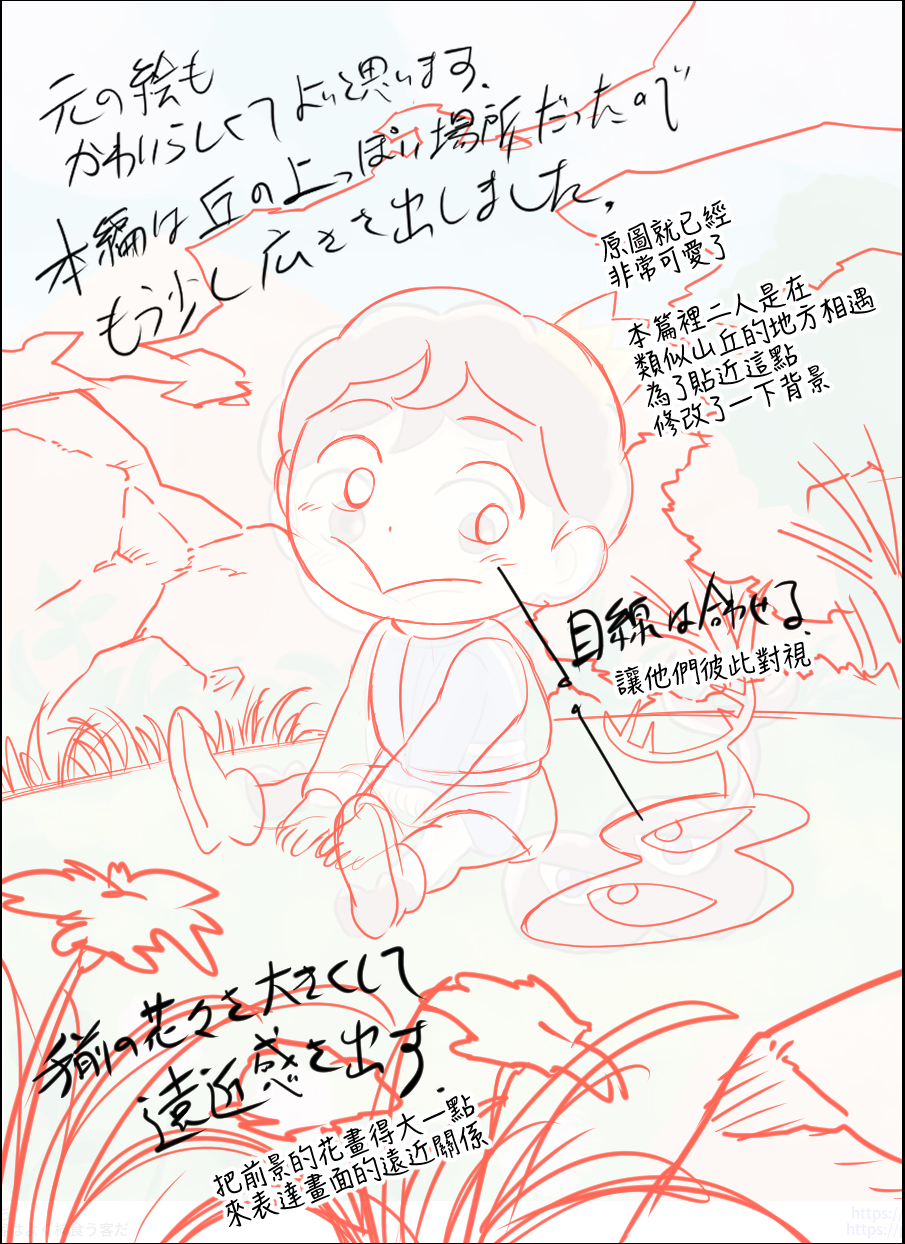 說起波奇和卡克,不免會想起二人就是在山丘上相遇的。因此我覺得可以幫地面加上弧度,讓場景看起來更像山丘,再將山丘後方的遠景加上樹木岩石等。之後,為了進一步突出場景為「二人獨處的空間」,可以把波奇和卡克的周圍做留白處理。還有就是運用前面提到的「遠、中、近景」技法,強調出前景的花朵。這樣一來便能夠避免畫面顯得過於空曠孤寂,還能營造出一種悠閒寧靜的氛圍。