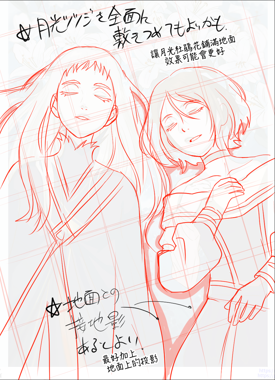第一眼看到這幅畫時,我一時不太確定「畫面中的人物是躺在地上嗎? 還是站著?」。我之所以會感到迷茫,是因為沒看到兩人在地面上的影子。而且頭髮也是。人物站立時,由於重力的影響,頭髮會自然向下垂,但躺下時由於後腦勺會被壓住,頭髮的走向與散開的方式會比正常情況下更隨意。因此,為了能更明顯地表現出「兩人是躺在地面上的」,我調整了投影與人物的頭髮。