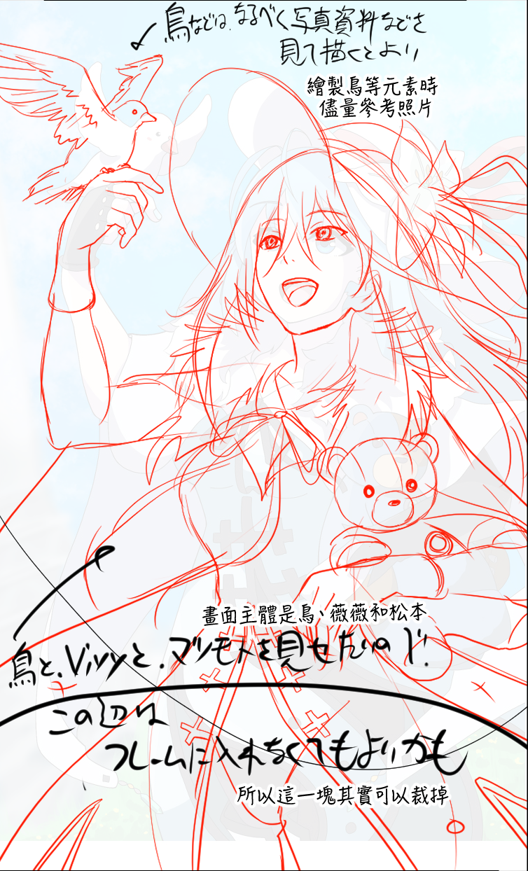 乍看會覺得畫面下方略顯單調。插畫的主體應該是薇薇、小鳥和松本,所以不妨把畫面重心更集中聚焦在這三個元素上。同時,最好還要能夠展現出女主角優美的身體曲線。所以我壓低了鏡頭的位置,使視角稍微變成仰視。原圖中,正對鏡頭的是薇薇的臉,因此下半身就會不可避免地處於俯視角度、超出畫面,從而導致畫面下方顯得單調。
