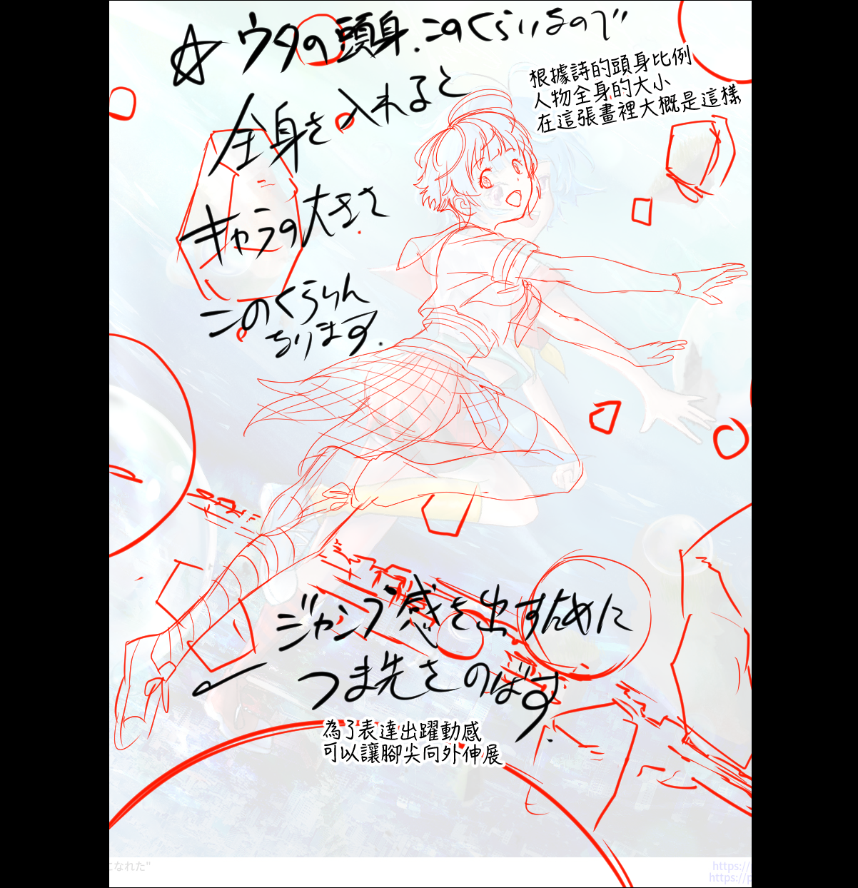 這幅畫應該是想表現詩跳躍在空中的矯捷身姿,因此不妨將四肢畫得更修長一些,這樣才能讓動作的幅度看起來更大,動作也更為靈動。還有一個細節就是,只需要讓角色的腳尖向外伸展開來,就能極為有效地強調出「正處於跳躍中」的動態表現。