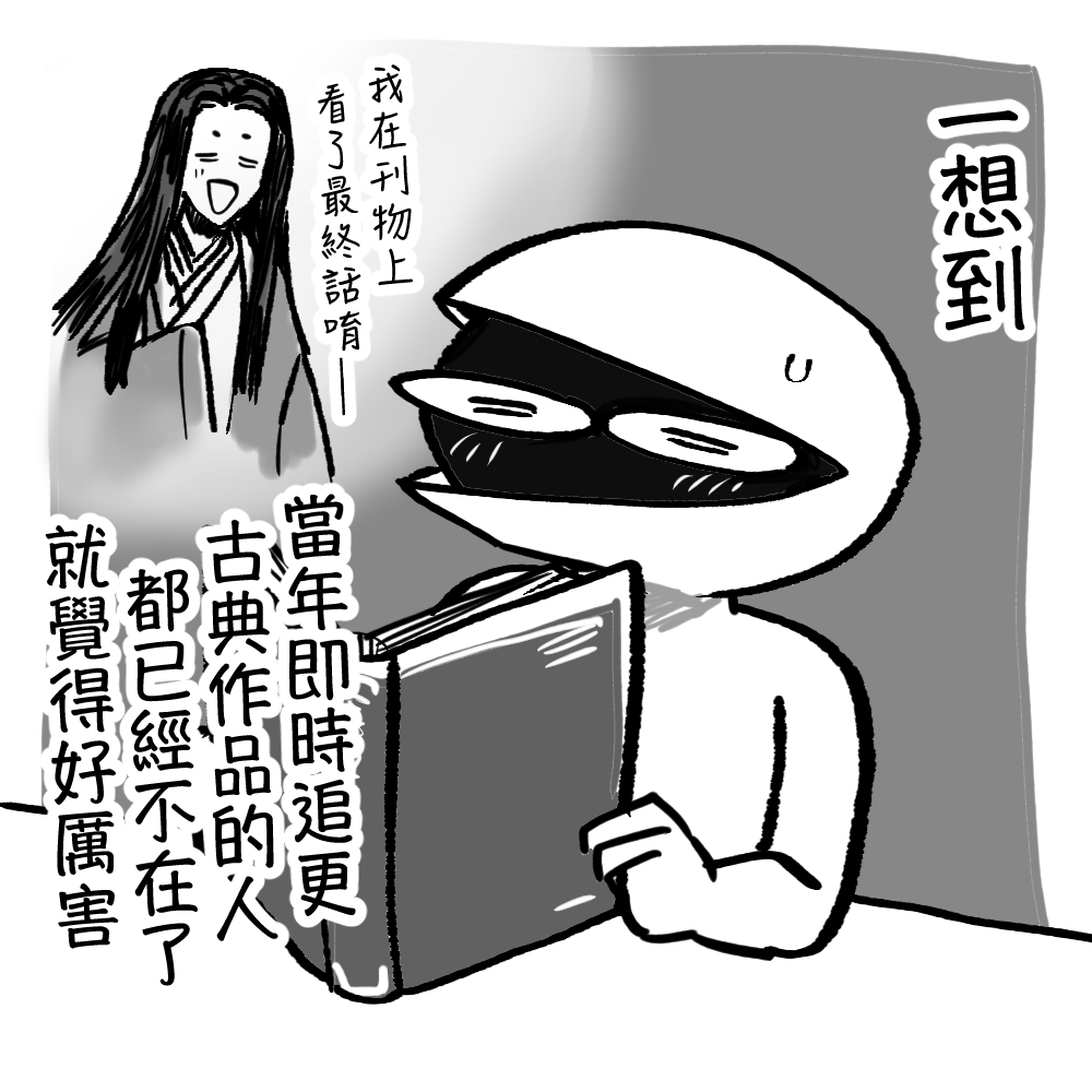 除此之外,我個人還有一個毛病,那就是作為廚的掌控欲——「想要盡可能地了解作品的一切」。因此,比起正熱火朝天、蓬勃發展的作品,我更偏好於那些已經安定下來或小告一段落,涉及範圍變得清晰明確的作品,因為這樣我就能夠開心地一口氣追完幾乎所有進度。畢竟我很難有一邊追連載,一邊還能補以前各種大小事的充沛精力。