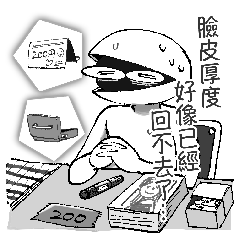 而最近的我已經是同人場老鳥,臉皮厚到差不多可以防彈,就算一堆東西忘了帶也無所謂,標價牌忘了就用封箱膠帶貼貼寫寫,找錢的零錢盒沒帶就用餅乾的空紙盒裝。好啦,我試試看找回以前的熱情啦……我說試試。