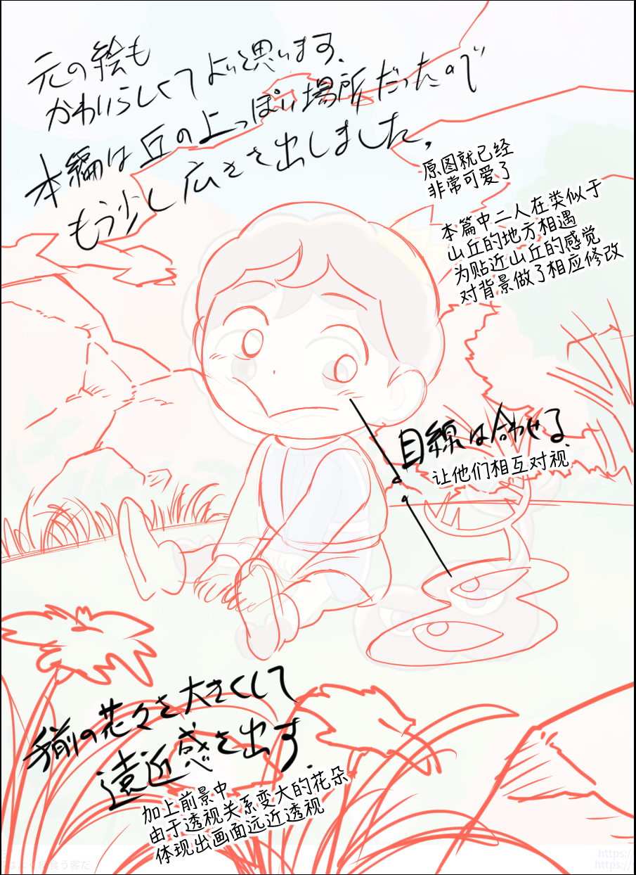 说起波奇和卡克,不免会想起二人就是在山丘上相遇的。因此我觉得可以给地面加上弧度,让场景看起来更像山丘,再给山丘后方的远景加上树木岩石等。在此基础上,为进一步突出此为「二人独处的空间」,可以对波奇和卡克两人的周围进行留白处理。还有就是运用到了前面提到过的「远、中、近景」技法,强调了前景的花朵。这样一来便能够避免画面显得过于空旷孤寂,还能营造出一种悠闲宁静的氛围。