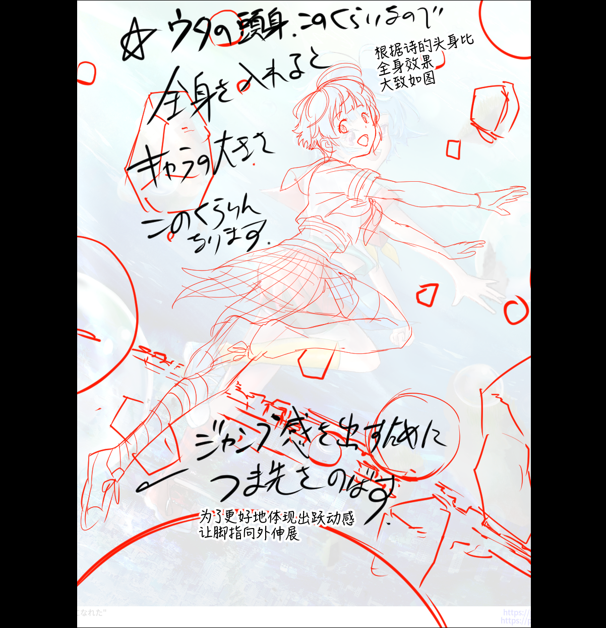 这幅画想表现的应该是诗飞跃于空中的矫捷身姿,因此不妨将四肢画得更修长一些,这样才能让动作幅度看起来更大,动态也更为灵动。还有一个细节就是,只需要让角色的脚尖伸展开来,就能极为有效地强调出其「正处于跳跃中」这一即时动态。