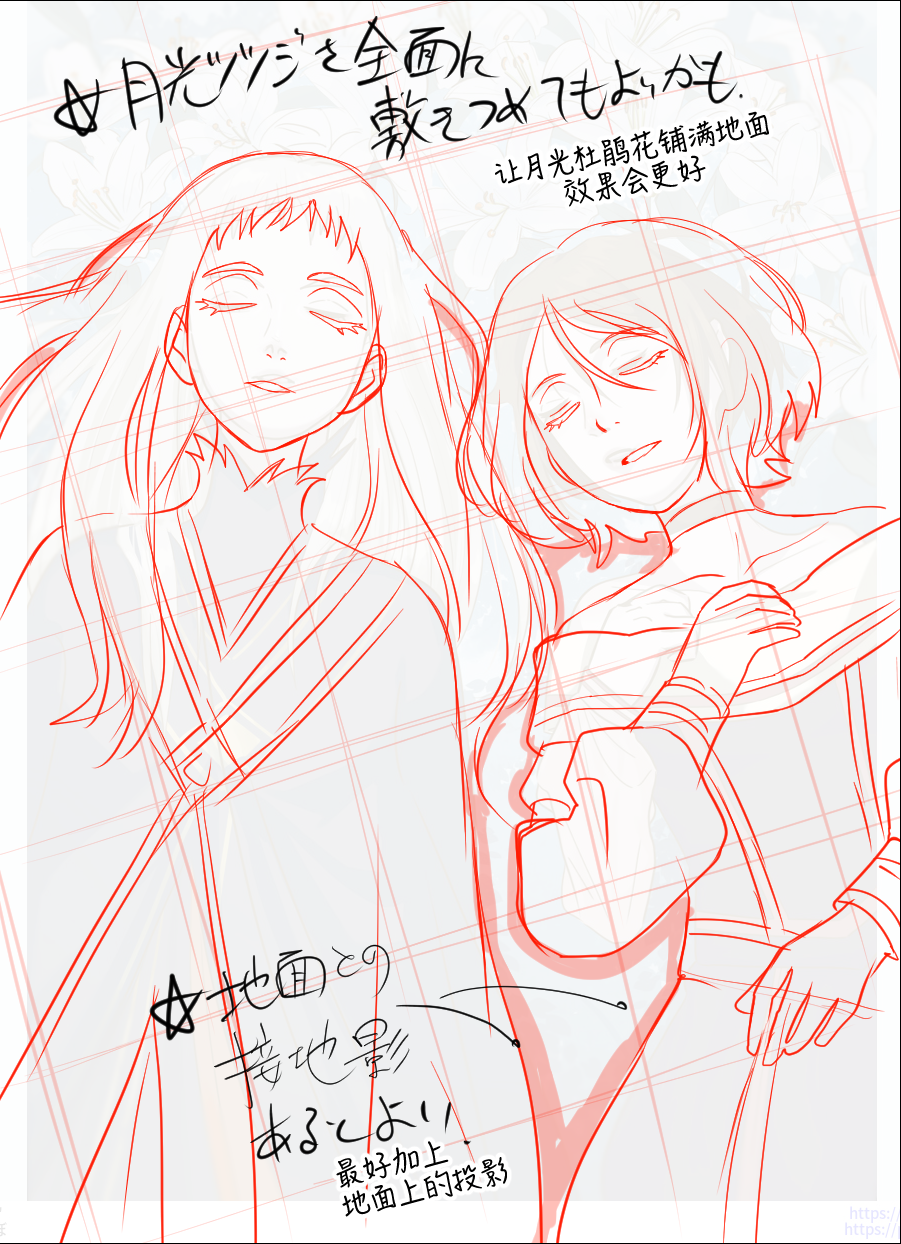 ── 接下来是这幅来自とんぼ的作品。描绘的是『花园里的吸血鬼』中的茉茉与芬恩一同沉睡的画面。改图时,老师对两位角色的头发等部分进行了调整。