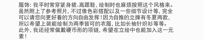 可以让对方绘制自己最常穿的风格,或者如果有喜欢的穿搭的话,可以附上一套全身照片。