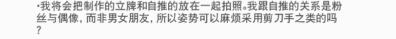 标明「并非女友,而是偶像与粉丝」这一人物关系,对我有很大帮助,在决定姿势与表情时能给予我一些参考。