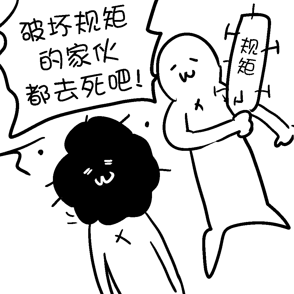 同理,在ACGN圈子里,除了官方发布的方针之外,像你们这个圈子一样,严苛到令人感到窒息的自治规矩霸道横行、把写着「这都不懂吗?」的燃烧瓶丢进匿名问答箱之类的网络杠精乱象丛生,也不是什么稀罕事。本应维护和平与安全的规矩,却反而导致了治安混乱。